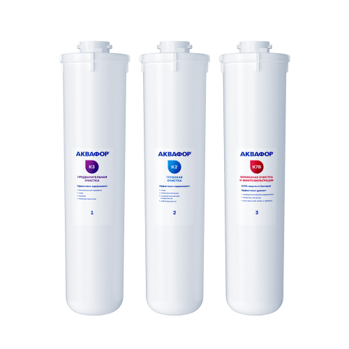 В комплекте три картриджа: K3, K2 и K7B. Они задерживают частицы размером больше 5, 0,8 и 0,1 микрон соответственно. Картридж K7B очищает воду от бактерий и паразитов. Половину объема занимает мембрана с порами в 1000 раз тоньше человеческого волоса. Все три картриджа поглощают из воды вредные примеси: хлор, железо, свинец и другие тяжелые металлы, нефтепродукты, пестициды и другие органические соединения.